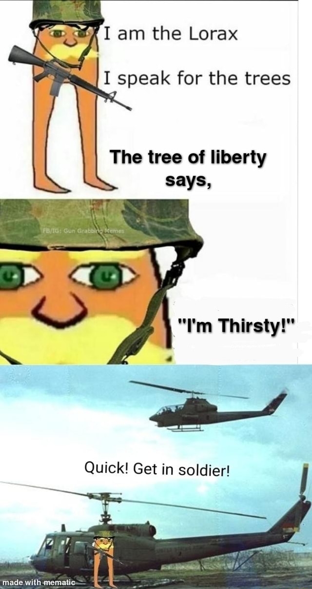 I Am The Lorax I Speak For The Trees The Tree Of Liberty Says I M Thirsty Quick Get In Soldier Off Made With Mematic